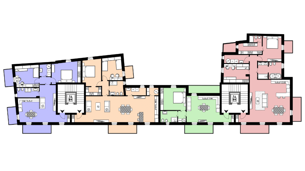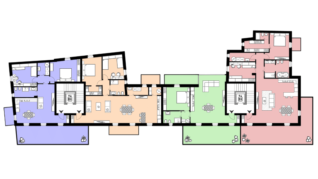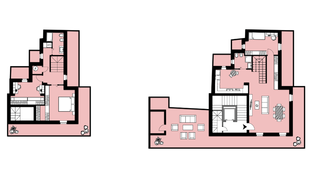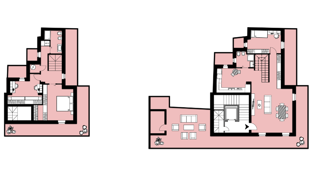 Gli ultimi livelli dell’edificio ospitano le soluzioni più esclusive del progetto: gli attici e i duplex. Queste unità si distinguono per la qualità degli spazi, l’ampiezza delle terrazze e una distribuzione interna pensata per garantire comfort e privacy. Le zone giorno si aprono verso l’esterno, creando un dialogo continuo tra ambienti interni e spazi all’aperto, mentre le zone notte risultano riservate e ben separate.