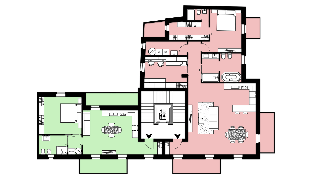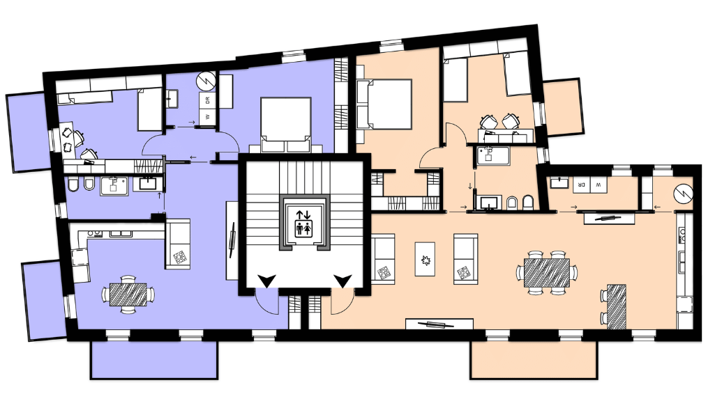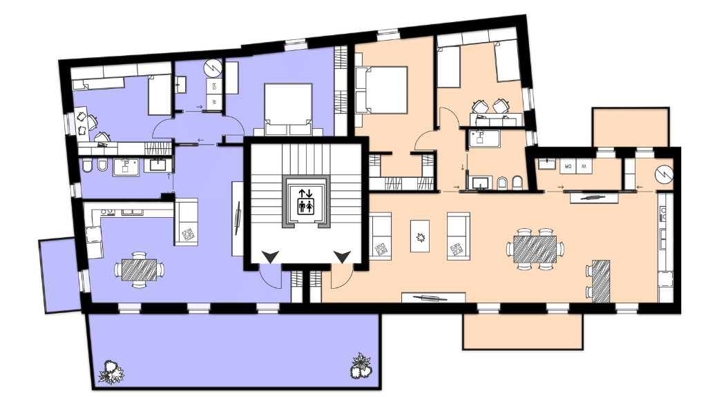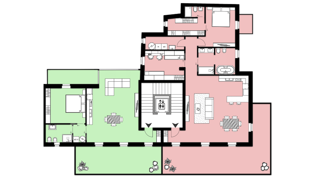 Attico Superior, elegante soluzione duplex sviluppata tra terzo e quarto piano: zona giorno di 56 mq, affacciata su 50 mq di terrazzi; al livello superiore, una spaziosa zona notte di 85 mq con balconi, per un perfetto equilibrio tra comfort interno e vivibilità degli spazi esterni.